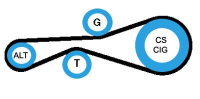 'Correas serpentinas' [serpentine belts]. de tres o mas canales. Las poleas en uso son de poca profundidad y estan diseniadas con canales en donde sentaran las bandas serpentinas; que para este fin, vienen acanaladas longitudinalmente en forma de 'V', [polea de 6 canales, usa correa de 6 canales o jorobas] Una sola banda puede mover todas las poleas de accesorios, asimismo; ocupan de un solo tensor que en forma automatica mantiene tensada la correa. El tipo de tensor usado, basa su funcionamiento en la fuerza de torsion [espiral] de un resorte] . A excepcion de algunos casos, que la tension se regula con un tornillo. Los fabricantes de estas bandas o correas imprimen en el dorso superior, las especificaciones para cada tipo de correa, acorde a la aplicacion o necesidad de cada vehiculo. |