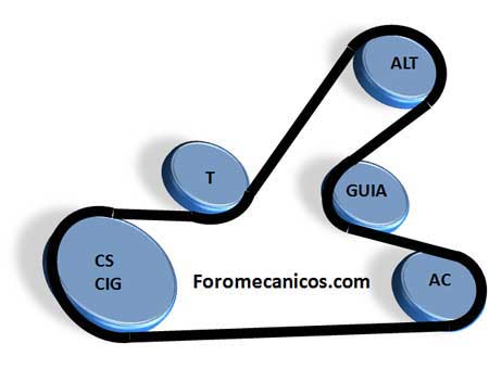 'Correas serpentinas' [serpentine belts]. de tres o mas canales. Las poleas en uso son de poca profundidad y estan diseniadas con canales en donde sentaran las bandas serpentinas; que para este fin, vienen acanaladas longitudinalmente en forma de 'V', [polea de 6 canales, usa correa de 6 canales o jorobas] Una sola banda puede mover todas las poleas de accesorios, asimismo; ocupan de un solo tensor que en forma automatica mantiene tensada la correa. El tipo de tensor usado, basa su funcionamiento en la fuerza de torsion [espiral] de un resorte] . A excepcion de algunos casos, que la tension se regula con un tornillo. Los fabricantes de estas bandas o correas imprimen en el dorso superior, las especificaciones para cada tipo de correa, acorde a la aplicacion o necesidad de cada vehiculo. DODGE: |