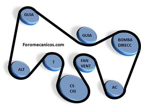 'Correas serpentinas' [serpentine belts]. de tres o mas canales. Las poleas en uso son de poca profundidad y estan diseniadas con canales en donde sentaran las bandas serpentinas; que para este fin, vienen acanaladas longitudinalmente en forma de 'V', [polea de 6 canales, usa correa de 6 canales o jorobas]. Una sola banda puede mover todas las poleas de accesorios, asimismo; ocupan de un solo tensor que en forma automatica mantiene tensada la correa. El tipo de tensor usado, basa su funcionamiento en la fuerza de torsion [espiral] de un resorte] . A excepcion de algunos casos, que la tension se regula con un tornillo. Los fabricantes de estas bandas o correas imprimen en el dorso superior, las especificaciones para cada tipo de correa, acorde a la aplicacion o necesidad de cada vehiculo.MITSUBISHI / |
