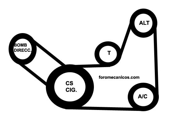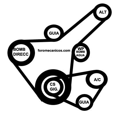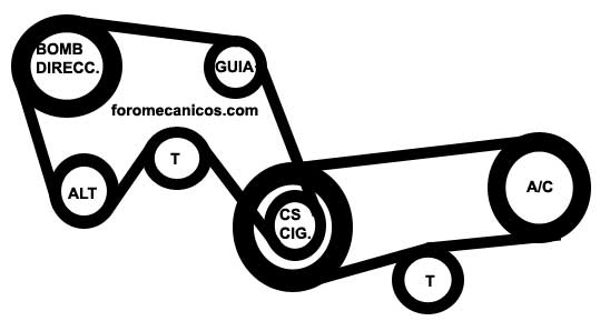 'Correas serpentinas' [serpentine belts]. de tres o mas canales. Las poleas en uso son de poca profundidad y estan diseniadas con canales en donde sentaran las bandas serpentinas; que para este fin, vienen acanaladas longitudinalmente en forma de 'V', [polea de 6 canales, usa correa de 6 canales o jorobas]. Una sola banda puede mover todas las poleas de accesorios, asimismo; ocupan de un solo tensor que en forma automatica mantiene tensada la correa. El tipo de tensor usado, basa su funcionamiento en la fuerza de torsion [espiral] de un resorte] . A excepcion de algunos casos, que la tension se regula con un tornillo. Los fabricantes de estas bandas o correas imprimen en el dorso superior, las especificaciones para cada tipo de correa, acorde a la aplicacion o necesidad de cada vehiculo. NISSAN: |
