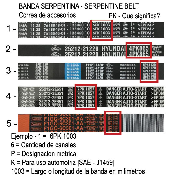 [ PK ]. El cual indica la cantidad de canales y el largo o longitud de la correa. ¿Por que es importante el # “PK”? Cuando se necesita una correa de reemplazo, siempre se debe realizar una búsqueda de aplicación o una referencia cruzada primero, pero cuando esto no arroja resultados, el número 'PK' es todo lo que necesita para determinar un tamaño de reemplazo. Un número PK es una medida de banda métrica estándard globalizada, impresa en la mayoría de las bandas serpentinas. ¿Como determino la banda de repuesto que necesito? Usando el ejemplo 6PK1003 anterior, sabemos que se trata de una correa de 6 canales con una longitud efectiva de 1003 mm y una circunferencia exterior de 1017 mm. Esto, junto con el rango de tolerancia recomendado por Gates [fabricante] de + 3 mm, nos permite utilizar un catálogo o una lista de tamaños para determinar el reemplazo apropiado, que en este caso sería [Gates K060394], una correa de 6 canales con una circunferencia exterior de 1.016 mm. Para efectos de instalar una banda o correa, se debe asegurar visualmente que las poleas esten alineadas. Asimismo todas las poleas deben estar en perfectas condiciones [ no pueden tener juego axial o inclinacion hacia los lados al girar en su mismo eje] Ejemplo: 6PK1003 6 - Esto indica el número de canales o jorobas en la banda; por lo tanto, este es un cinturón de 6 canales o jorobas. PK: la 'P' - indica una designación métrica y la 'K' - indica que la correa es de uso automotriz según SAE J1459. 1003 - es la longitud efectiva de la correa expresada en milímetros. ¿Cual es la longitud Efectiva? La longitud efectiva se refiere a la medida de la circunferencia exterior, que se puede medir facilmente con una cinta metrica. Aunque un cálculo científico es la única forma de determinar la circunferencia exterior real, en promedio, agregar 14 mm a la longitud efectiva da como resultado una circunferencia exterior. Diagramas Mecanica Automotriz: El procedimiento para cambiar y/o instalar una banda, correa o faja, difiere entre un modelo y otro; algunos usan tensores automaticos, y otros ocupan tornillos reguladores de tension. En el esquema inferior, puede ver un ejemplo, usado por vehiculos Ford |