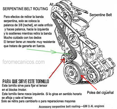 En este tipo de instalacion de banda o serpentina, solo se ocupa. aplicar una llave, para mover el tensor hacia un lado y sostenerlo, eso es suficiente para, que la banda o correa se afloje, y asi pueda ser removida de su sitio. La instalacion, es el mismo trabajo a la inversa. Tenga mucho cuidado; no ponga los dedos entre polea y correa; la llave se puede resbalar. y atrapar su mano. |