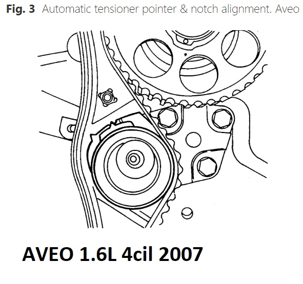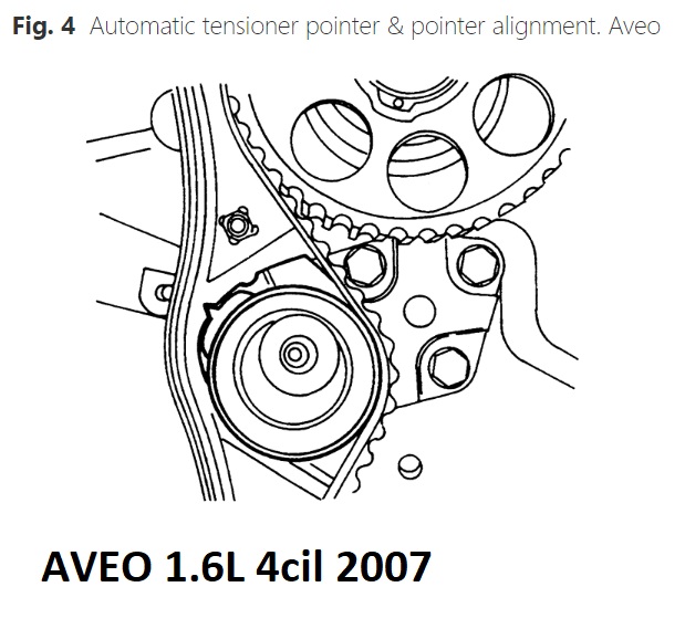 27.Rotate the coolant pump until the adjust arm pointer aligns with the pointer on the tensioner bracket, Fig. 4.