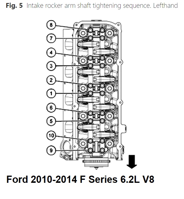 j.Tighten lefthand intake rocker arm shaft assembly bolts in sequence as illustrated in Fig. 5. First step, torque bolts to 89 inch lbs., second step, torque to 177 inch lbs., third step, tighten an additional 60°.