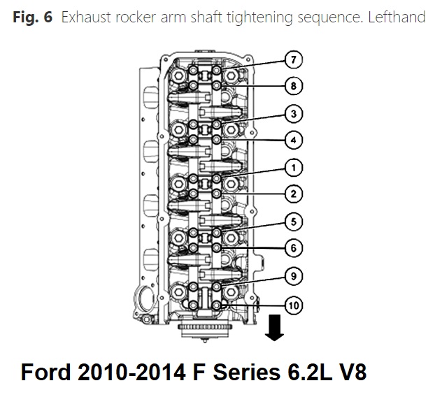 k.Tighten lefthand exhaust rocker arm shaft assembly bolts in sequence as illustrated in Fig. 6. First step, torque bolts to 89 inch lbs., second step, torque to 177 inch lbs., third step, tighten an additional 60°.