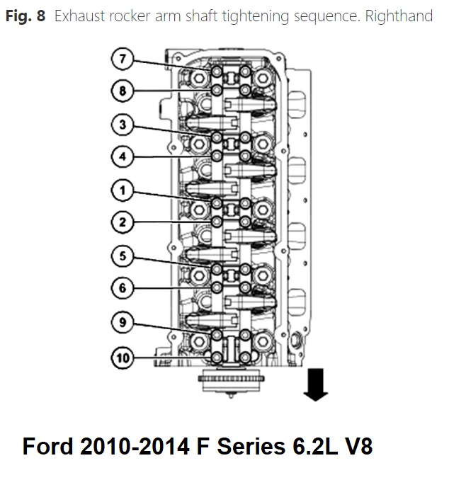 m.Tighten righthand exhaust rocker arm shaft assembly bolts in sequence as illustrated in Fig. 8. First step, torque bolts to 89 inch lbs., second step, torque to 177 inch lbs., third step, tighten an additional 60°.