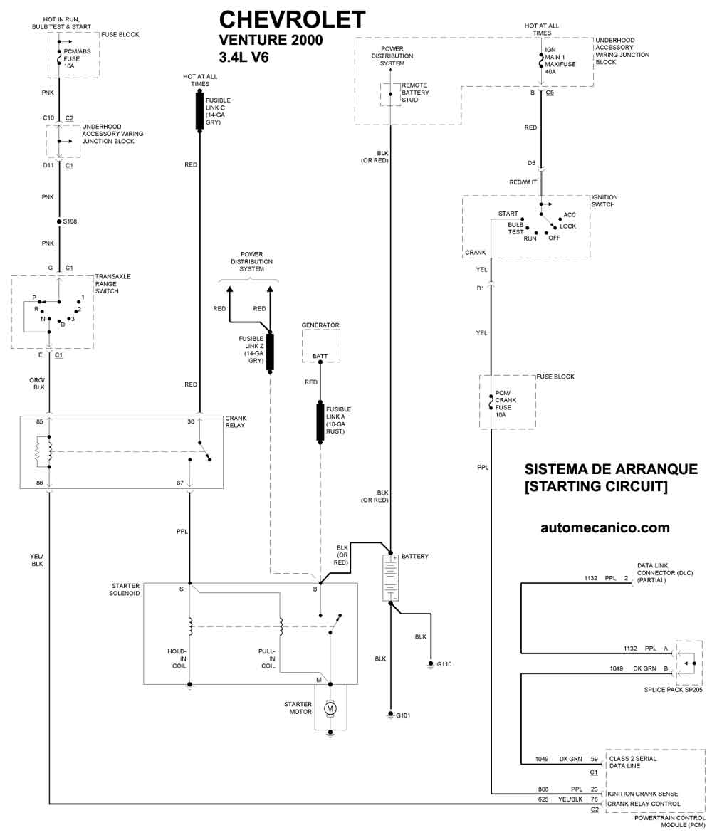 buen dia espero me ayuden , tengo una venture 2000 que no enciende , este es el detalle . sin poner la llave al switch el relevador de ignicion se energiza , cuando esto no deberia de ser, y se checa voltage al modulo y le llegan los 12 volts , ahora al dar marcha con la llave el relevador de ignicion se desenergiza y se cae el voltage al modulo y al dar marcha ya no enciende ya que no hay chispa .. lo que hice fue el contacto de ignicion lo puenteo para que al dar marcha no se caiga el voltage al modulo y solo asi enciende el motor . esto lo hice ya que varios electricos ya la habian checado y le habian cambiado la computadora pero hacia lo mismo, no encendia . bueno checando el diagrama eaqui en automecanico no viene el esquema de arranque , ni relevadores de ignicion y no se de donde viene la señal al relevador de ignicion para checar ya que no se si la señal viene de la computadora o del switch de encendido .... no se si sea algun corto o porque estando el motor sin la llave el relevador de ignicion se energiza y al poner la llave se cae el voltage y ya no enciende, otro detalle tampoco se energiza el reley de la bomba de gasolina se agradeceria si alguien tiene el manual de reparacion para checar todo el sistema de arranque , o alguna sugerencia
